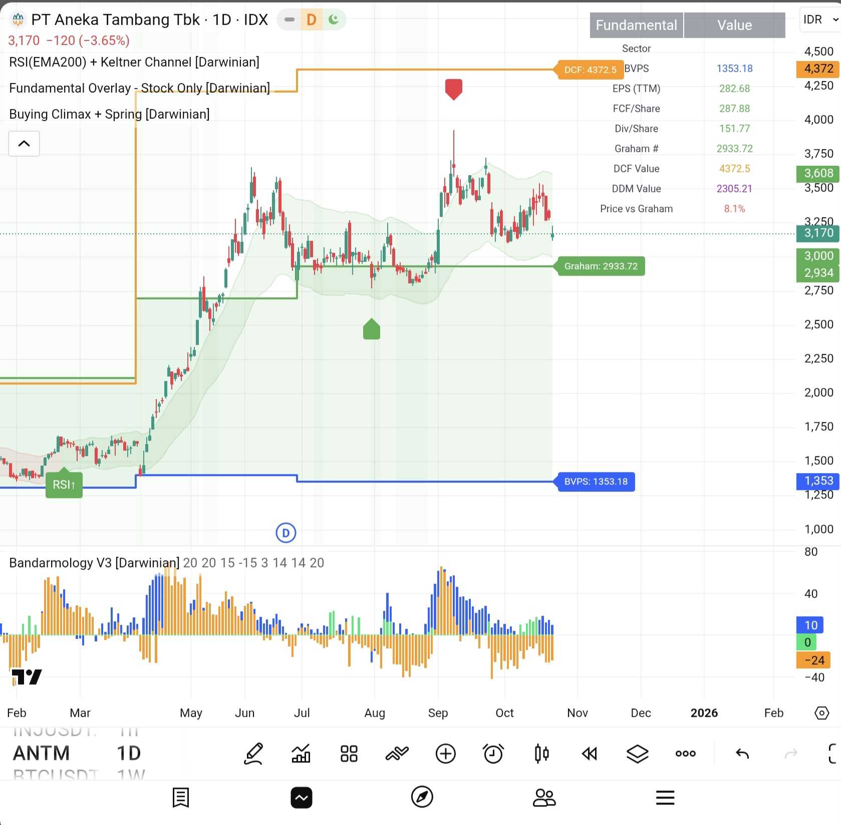 @Akmon $ANTM Asumsi DCF saya malah di 4370.. di indicator saya pucuk terdeteksi di 3930.. Graham Number (garis hijau) itu jadi base harga pada retracement terdahulu (boleh confirm dengan volume profile), so support terkuat ada di 2930.. baik pake teknikal, maupun fundamental, terlalu dini untuk menyatakan ANTM mulai masuk Bearish.. adalah biasa setelah uptrend ada koreksi/pullback/retracement..