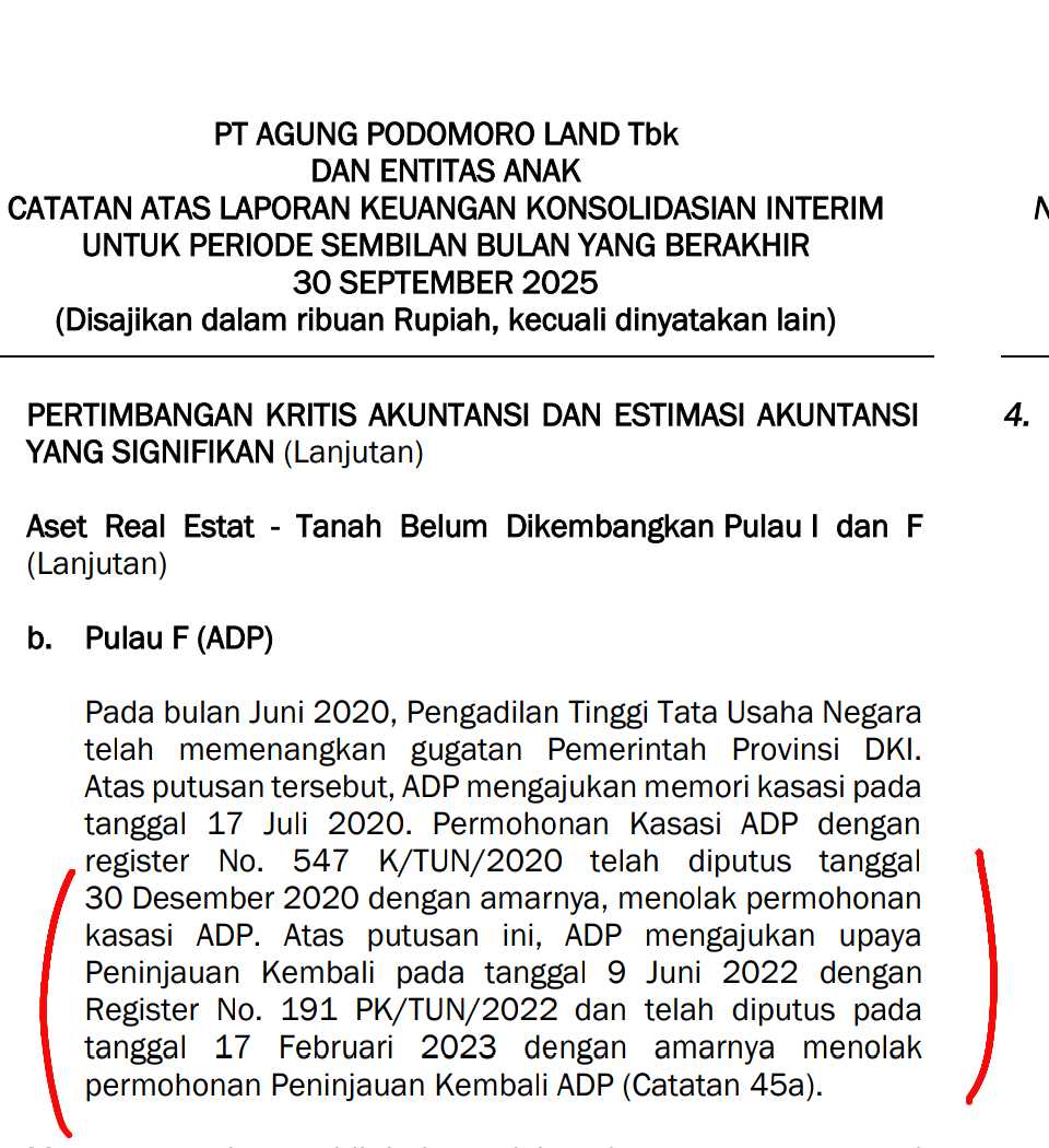Di APLN, ketidakpastian material menempel langsung ke persediaan real estat sekitar Rp826,68 miliar. Angka itu datang dari Pulau I Rp510,65 miliar dan Pulau F Rp316,02 miliar. Ini bukan sengketa batas lahan biasa, tapi sengketa yang berakar dari pembatalan izin reklamasi, dan sudah ada putusan Mahkamah Agung yang membatalkan izin. Dampaknya sederhana tapi tajam, selama izin belum pulih, proyek sulit jalan, pendapatan masa depan tertahan, dan nilai persediaan berisiko kena penurunan nilai. Upgrade skill https://cutt.ly/Ve3nZHZf