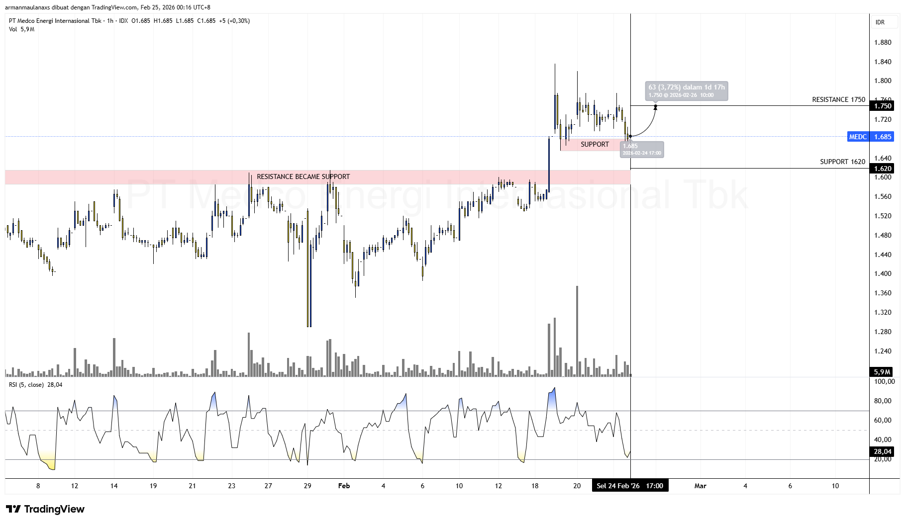 Trading Plan PT Medco Energi Internasional Tbk ($MEDC) – 1H: Harga bergerak konsolidasi di area 1.685 setelah breakout dan retest, dengan area support kuat 1.620 (resistance sebelumnya yang menjadi support); selama bertahan di atas level ini, potensi kenaikan ±3–4% menuju resistance 1.750 masih terbuka. RSI(5) ~28 menunjukkan kondisi oversold yang membuka peluang technical rebound jangka pendek. Entry ideal 1.650–1.700 dengan stop loss di bawah 1.620; setup ini bullish continuation pasca breakout & retest.