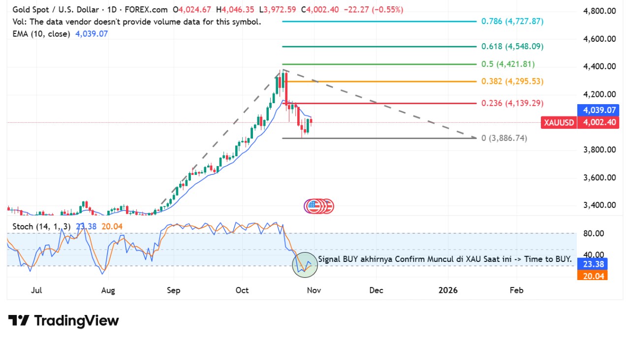 XAU Secara Technical n Overall Viewnya terlihat mulai Kembali menarik lagi saat ini setelah XAU ini terlihat di hari Kamis lalu sudah berhasil untuk bisa rebound n naik dengan luar biasa solid n signifikan setelah sebelumnya XAU ini terlihat terus retrace hingga bottomnya ada di 3886 USD dimana terlihat XAU ini sudah confirm Kembali muncul Signal BUY dari indicator Stochasticnya, hal ini bagus karena artinya menunjukkan bahwa XAU ini kemungkinan fase retracenya sudah berakhir n berpotensi akan bisa Kembali naik n melanjutkan Bullish Trendnya Kembali kedepannya.
