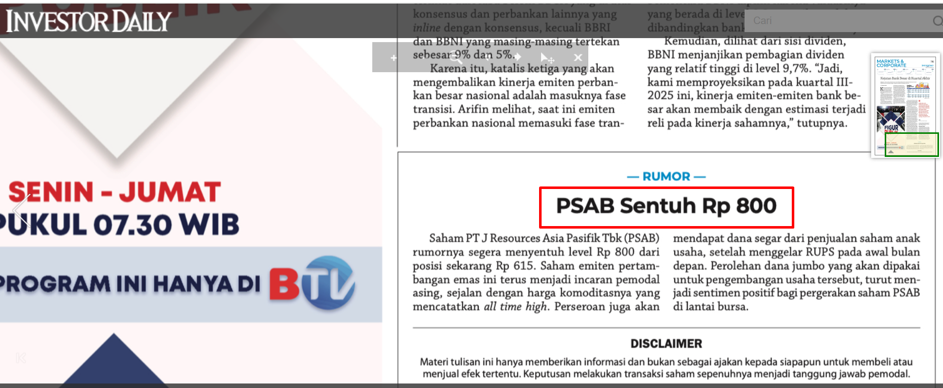 Saham PT J Resources Asia Pasifik Tbk ($PSAB) dikabarkan berpotensi menembus level Rp 800 . Rumor pasar menyebutkan, saham emiten pertambangan emas ini kembali diminati investor asing seiring harga komoditas emas yang berpotensi mencapai rekor tertinggi. Selain itu, rencana perseroan mendapatkan dana segar dari penjualan saham anak usaha serta agenda RUPS di awal bulan depan turut memperkuat sentimen positif terhadap pergerakan saham PSAB di bursa.