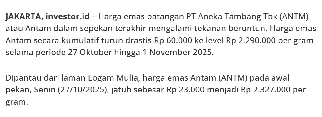 Harga emas Antam masih mengalami tekanan setelah koreksi sepekan terakhir, turun hingga ke area Rp 2.290.000 per gram. Saat ini harga mulai mendekati area support penting, sehingga menjadi momentum untuk bersiap akumulasi sebelum potensi pantulan terjadi. Strateginya, tetap cermati pergerakan harga di area support ini dan manfaatkan peluang beli sebelum rebound menguat.