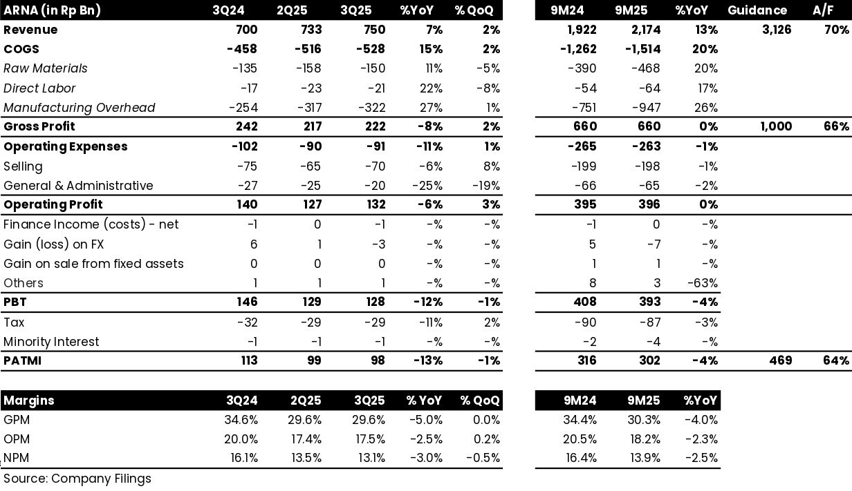 Arwana Citramulia ($ARNA) mencatatkan laba bersih sebesar 98 miliar rupiah pada 3Q25 (-13% YoY, -1% QoQ). Hasil ini membuat laba bersih selama 9M25 mencapai 302 miliar rupiah (-4% YoY), setara ~64% guidance 2025 dari manajemen. Laba bersih pada 3Q25 utamanya ditekan oleh pertumbuhan pendapatan yang melambat di tengah peningkatan beban pokok pendapatan akibat kenaikan beban pabrikasi (+27% YoY, +2% QoQ) dan bahan baku (+11% YoY, -5% QoQ), sehingga margin laba kotor pada 3Q25 turun secara tahunan ke level 29,6% (vs. 3Q24: 34,6%, 2Q25: 29,6%). Adapun margin laba usaha menurun secara tahunan ke level 17,5% (vs. 3Q24: 20%, 2Q25: 17,4%) di tengah penurunan opex (-11% YoY, +1% QoQ).