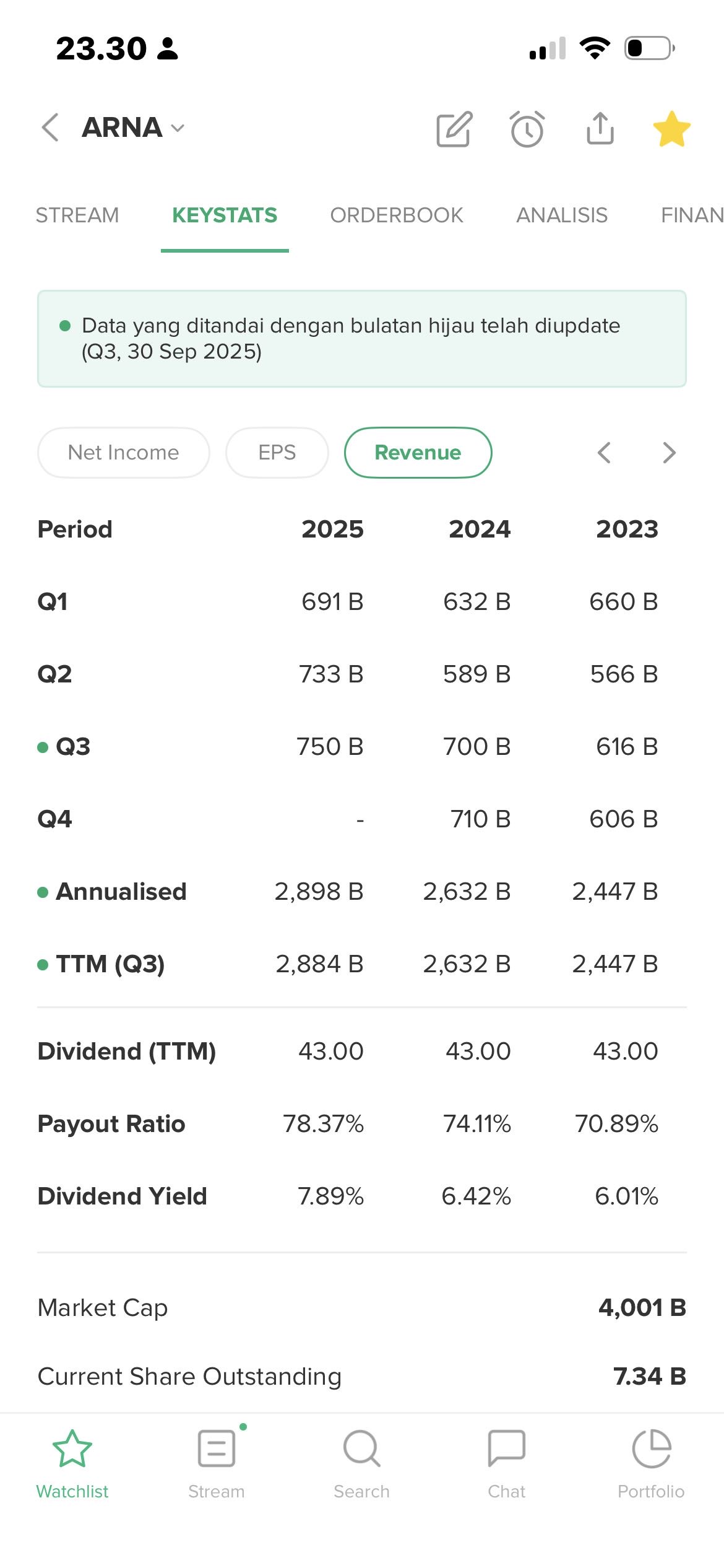 Saya di $ARNA hanya sedang berharap revenue semakin naik dan lapkeu Q4 nya bener2 ++++, dan buyback perusahaan segera selesai sehingga owner perusahaan tinggal fokus naikin harga saham aja. kalau semua lancar, dan Q4 ++++. satu berita dengan sentimen positif bisa langsung naikin drajat saham ini minimal ke sini.