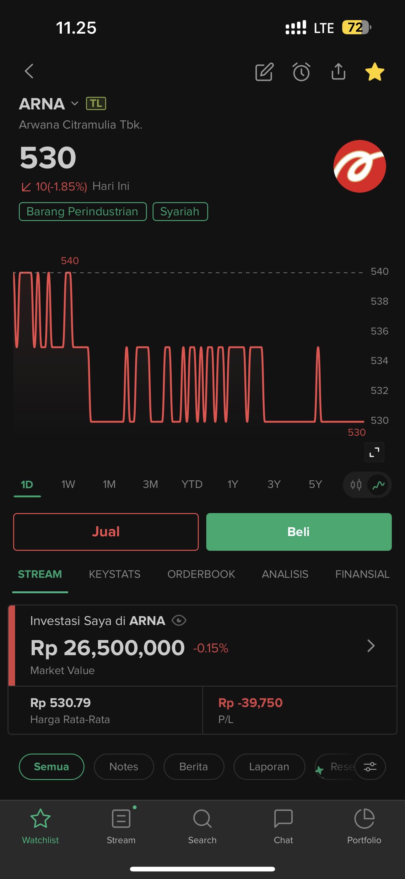 🔼 $ARNA gap up ke 535 (+10 / +1.9%) dari 525