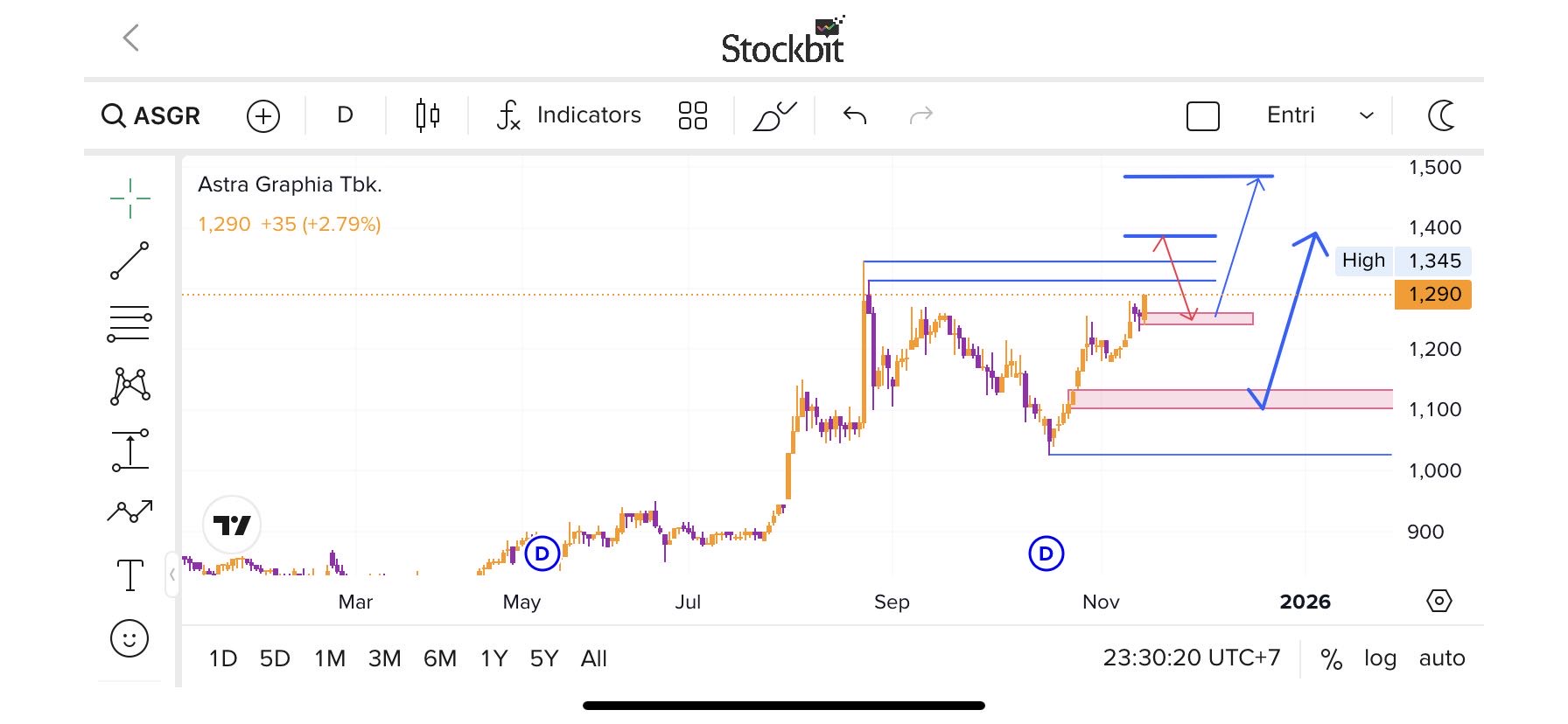 Rabu, 26 November 2025, ASGR test support 1240 dan muncul 6 green. Selama ASGR berada di atas level 1240, maka ASGR berpeluang kembali naik ke arah 1340 dan 1400.