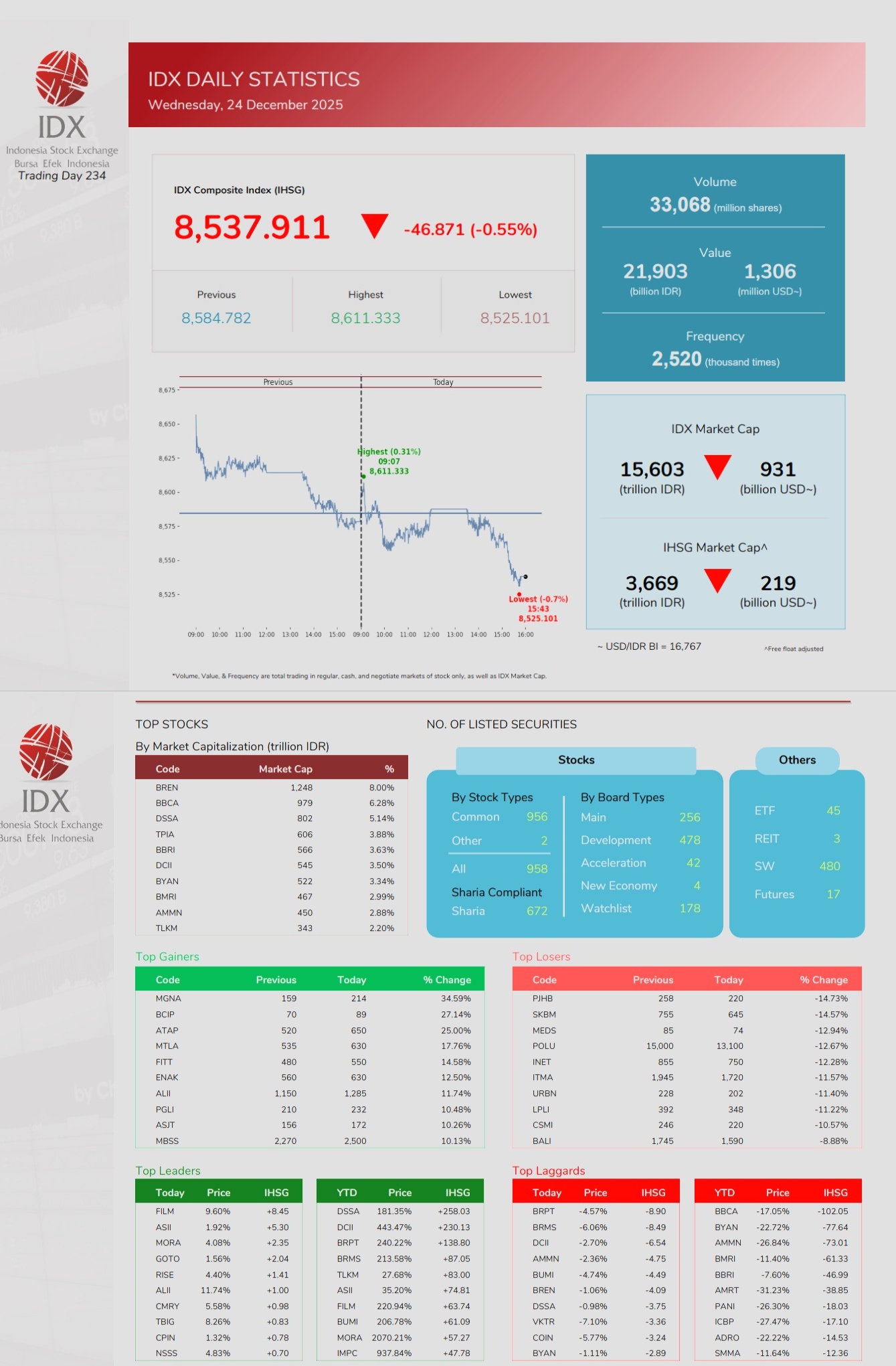 Pada Rabu, 24 Desember 2025, IHSG turun 0,55% ke level 8.537.