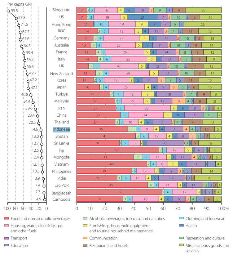 Ternyata porsi belanja orang Indonesia untuk restoran dan hotel cukup besar. Lebih dari pendidikan dan kesehatan. Mungkin karena ada faktor subsidi kali ya.