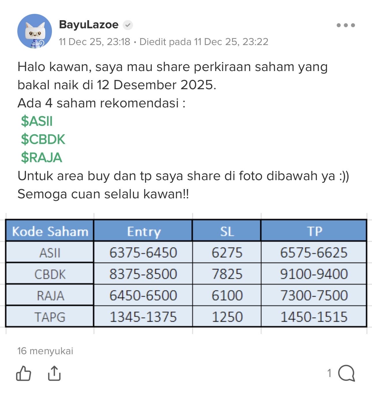 Ada yang setuju saya share tiap hari (malam sebelum market buka)