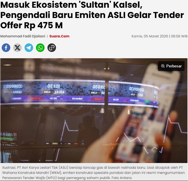 IDXChannel - Pengendali baru PT Asri Karya Lestari Tbk (ASLI) mengumumkan rencana pelaksanaan Penawaran Tender Wajib (Mandatory Tender Offer/MTO) kepada pemegang saham publik sebagai tindak lanjut dari proses pengambilalihan yang telah dilakukan sebelumnya.