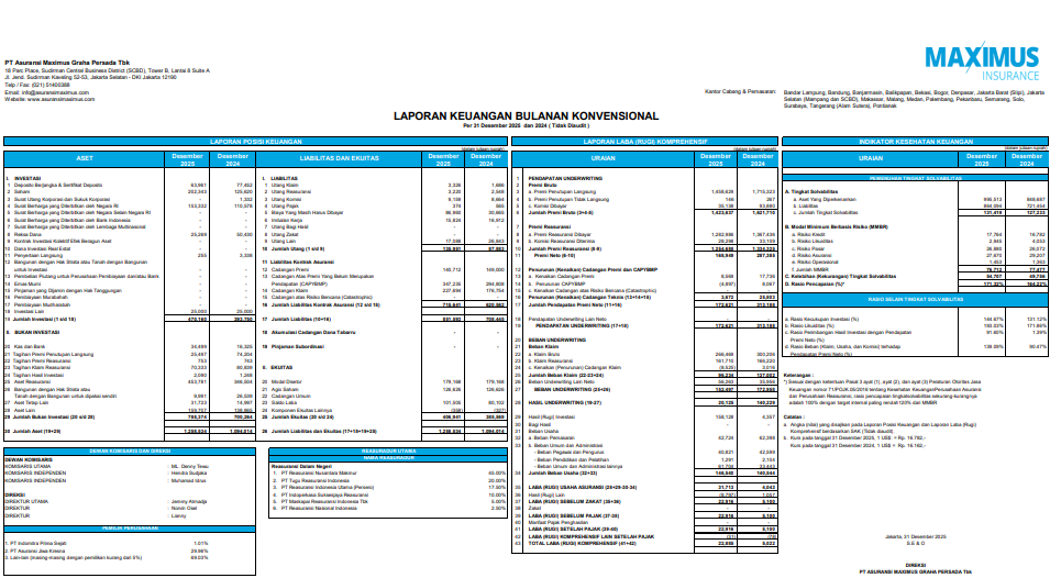 PT Asuransi Maximus Graha Persada Tbk ($ASMI) pada FY2025 menunjukkan pemulihan yang nyata dari sisi neraca dan solvabilitas, dengan total aset meningkat menjadi sekitar Rp1,26 triliun (+15%), ekuitas naik sekitar Rp21 miliar menjadi ±Rp407 miliar (+5,5%), serta rasio solvabilitas membaik ke 171%, jauh di atas batas minimum regulator, dan tanpa utang berbunga, sehingga risiko kelangsungan usaha menurun signifikan. Dari sisi kinerja, laba bersih FY2025 meningkat tajam menjadi sekitar Rp22,9 miliar dari Rp5,1 miliar pada FY2024 (+355.7%)