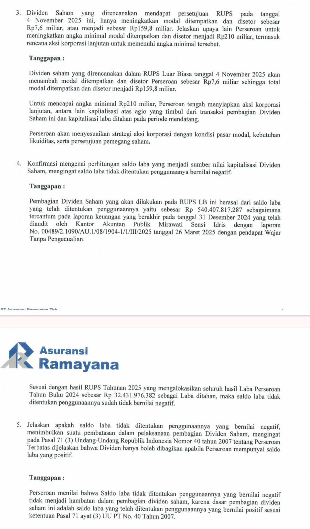 EmitenNews.com - PT Asuransi Ramayana Tbk (ASRM) memberikan tanggapan resmi kepada Bursa Efek Indonesia (BEI) terkait rencana pembagian dividen saham dan pemenuhan ketentuan modal minimum sesuai dengan regulasi Otoritas Jasa Keuangan (OJK). Penjelasan ini merupakan jawaban atas surat BEI No. S-1128...