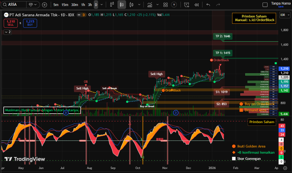 Meskipun kenaikan dari bottom sudah mencapai 167,70%, di mana harga terendahnya (Rp452,-), harga ASSA berpotensi melanjutkan penguatan selama ada demand yang agresif pada rentang harga 1.152 - 1.190.