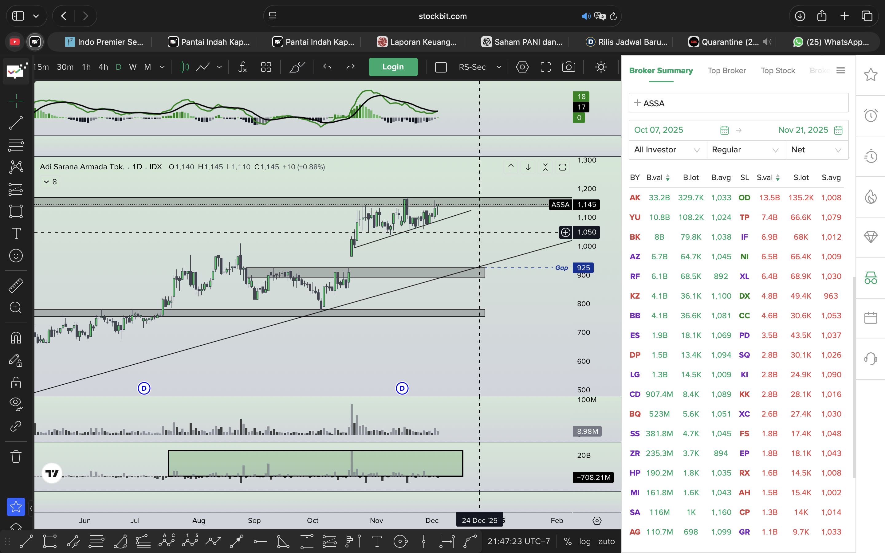 $ASSA — Terdapat pola yang sangat cantik dimata saya, alias pola Ascending Triangle. Broker Summary sejak Swing Low terakhir diisi oleh Broker-broker kakap, alias AK YU BK. Gacuma itu, mereka punya Avg di area 1038-1024, makanya setiap kali ASSA turun kebawah 1080, selalu ada yang lawan/ jagain diarea itu.