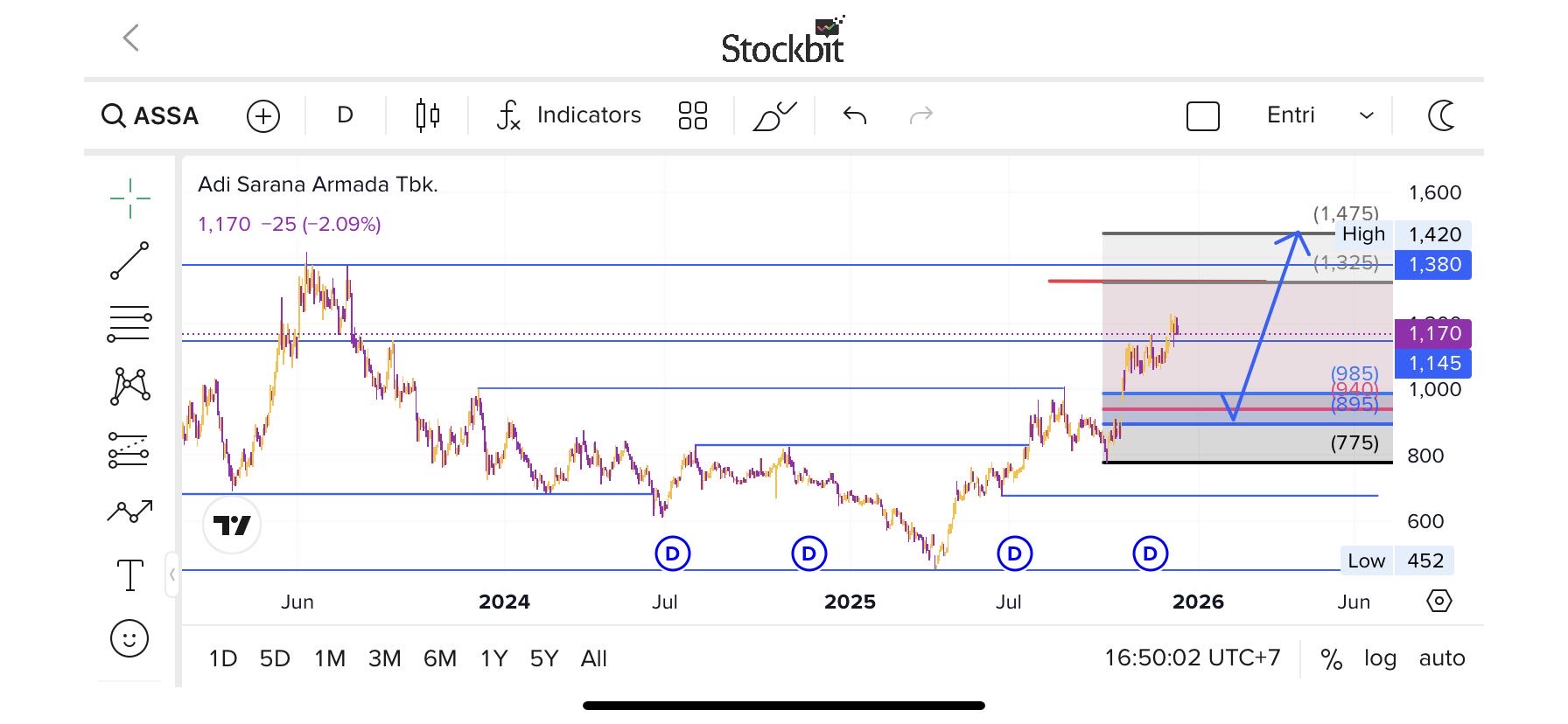 Berdasarkan Analisa Data Historis Harga Saham $ASSA 5 Tahun terakhir (Open & Close), mulai tanggal 02/01/2020 sampai dengan tanggal 12/12/2025, dijelaskan sebagai berikut:
