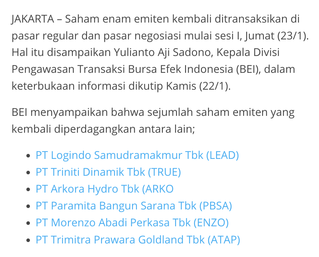 Keenam saham tersebut adalah PT Trimitra Prawara Goldland Tbk (ATAP), PT Morenzo Abadi Perkasa Tbk (ENZO), PT Paramita Bangun Saran...
