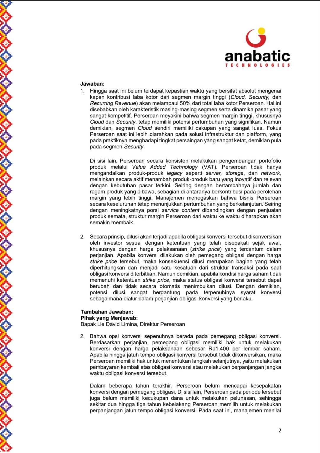 PT Anabatic Technologies Tbk adalah perusahaan yang bergerak dalam bidang konsultan sistem teknologi informasi, yang terdiri dari solusi sistem integrasi, layanan business process outsourcing, layanan teknologi informasi outsourcing, dan layanan distribusi dengan nilai tambah dan bisnis pendukungnya. Melalui pertumbuhan organik serta merjer dan akuisisi, jangkauan usahanya telah merambah ke berbagai bidang, yang kini dikelola melalui 55 (lima puluh lima) anak-anak usaha: 5 (lima) anak usaha langsung dan 50 (lima puluh) anak usaha tidak langsung. Selain melayani institusi-institusi terkemuka di Indonesia, Anabatic juga telah memb... Read More