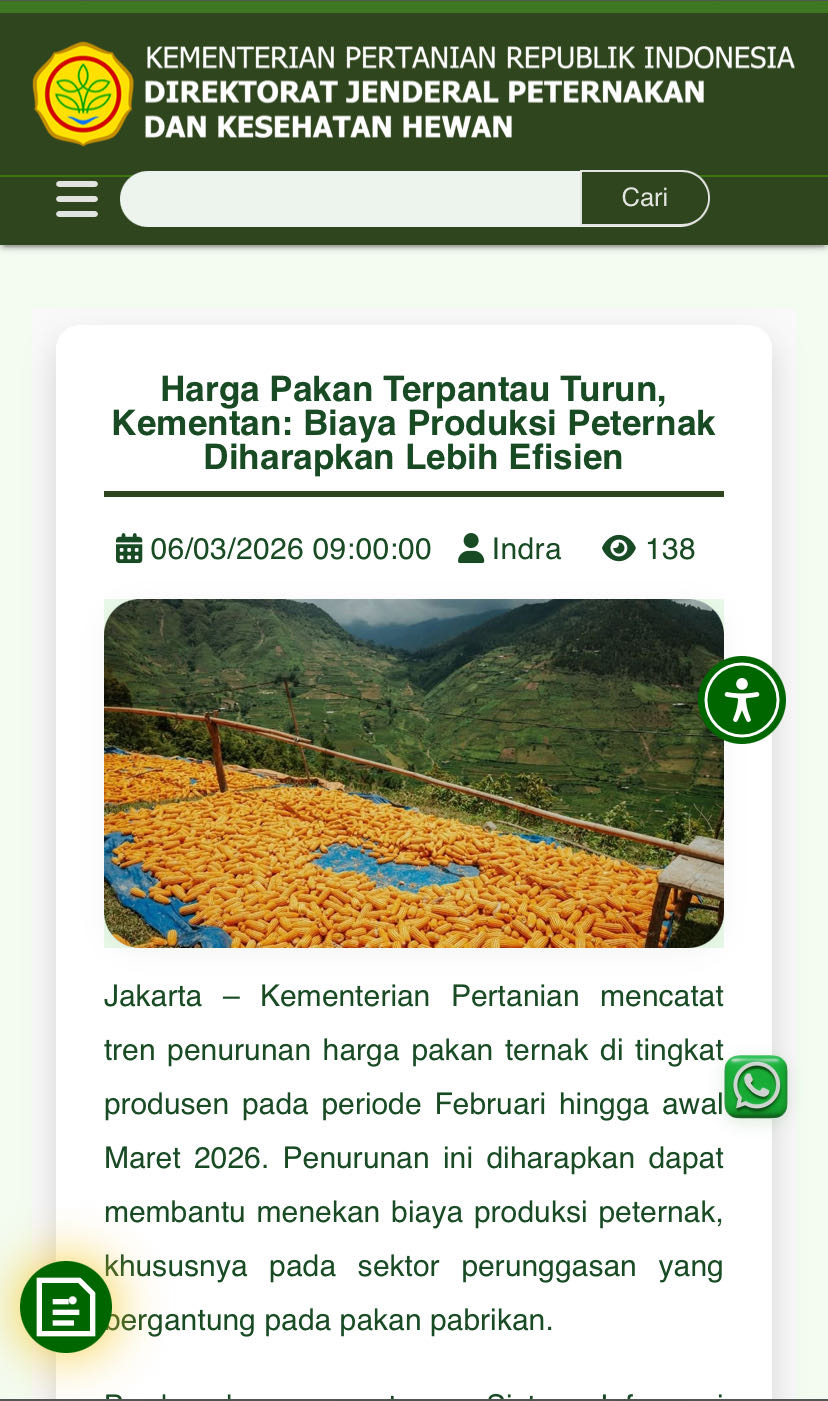 🟢 [IMPACT: POSITIF] — "Harga Pakan Ayam Pedaging dan Petelur Mulai Turun di Awal 2026" | 8 Mar 2026. Penurunan harga pakan BR1, BR2, dan Layer Phase P3 rata-rata Rp 74–112/kg dari data SPORA Kementan adalah kabar baik nyata untuk efisiensi biaya produksi AYAM.