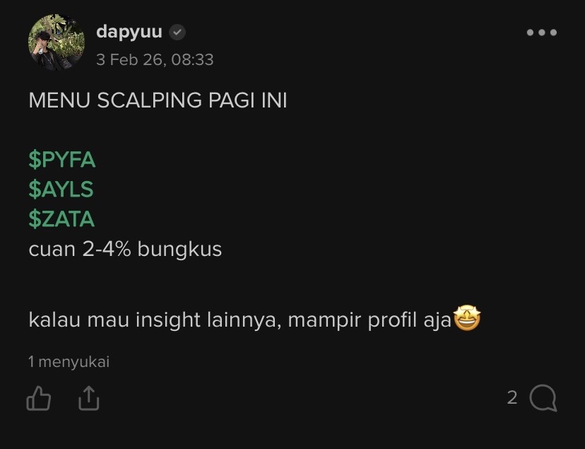 Saham2 yg menarik dipantau untuk scalping hari Jumat, 6 February 2026. Semoga cuan. Aamiin.