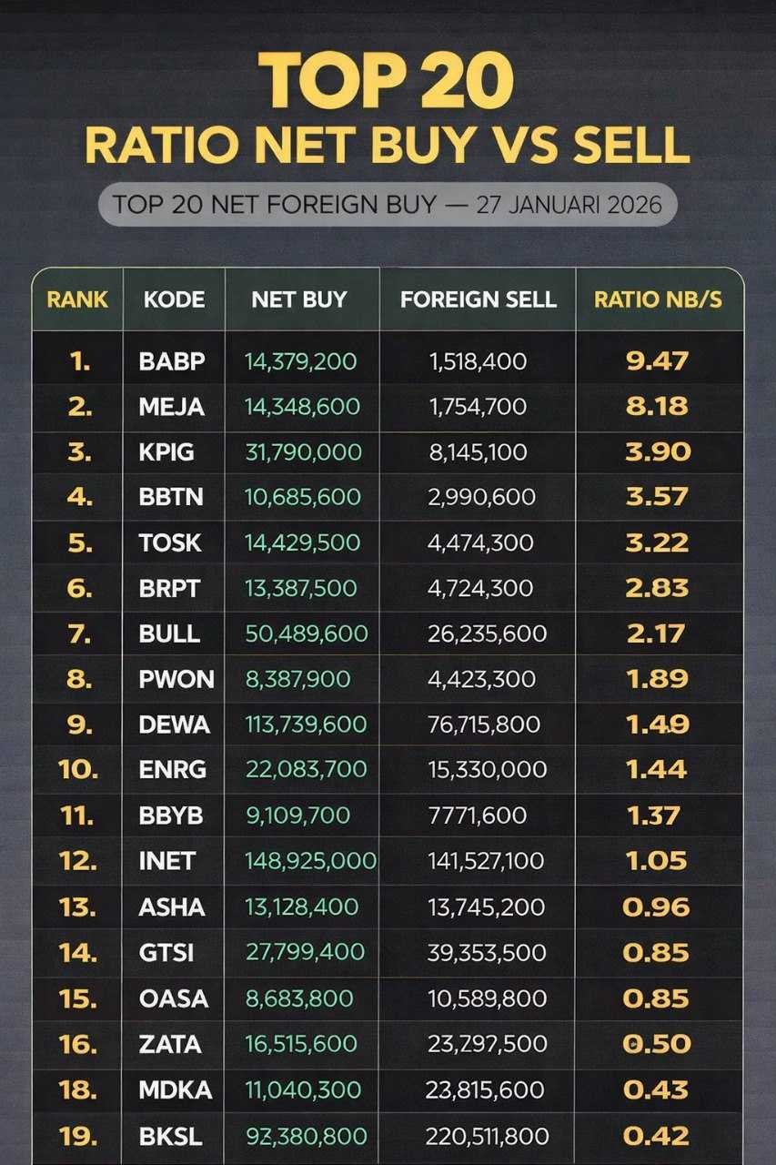 $BABP & $MEJA → rasio ekstrem (sell sangat kecil) → akumulasi asing super bersih.