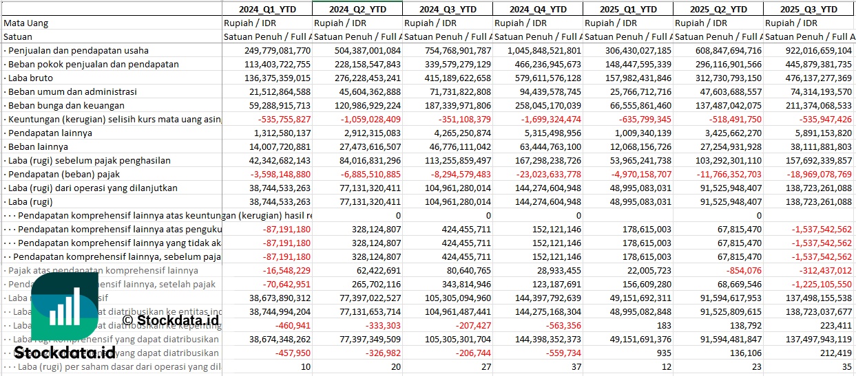 •Laba periode berjalan (net profit, 9M25): Rp 138,723,261,088 (vs Rp 104,961,280,014 9M24). EPS dasar (9M) Rp 35,26 per saham.