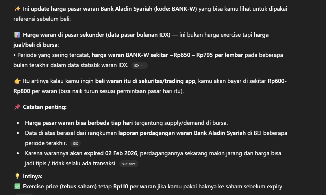Periode yang sering tercatat, harga waran BANK-W sekitar ~Rp650 – Rp795 per lembar pada beberapa bulan terakhir dalam data statistik waran IDX.