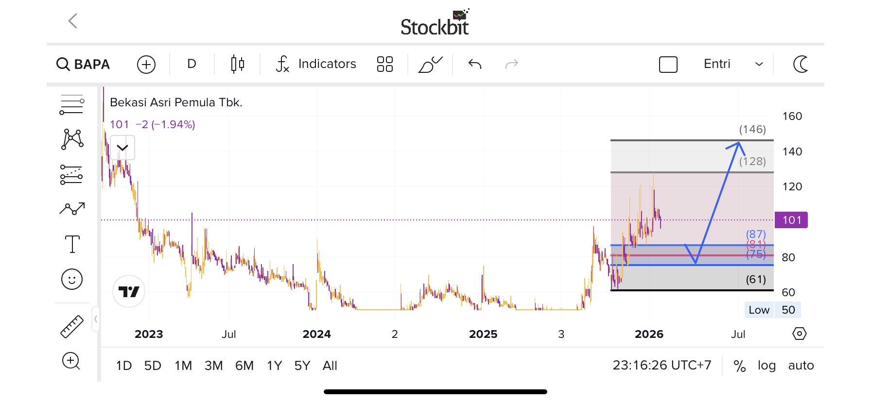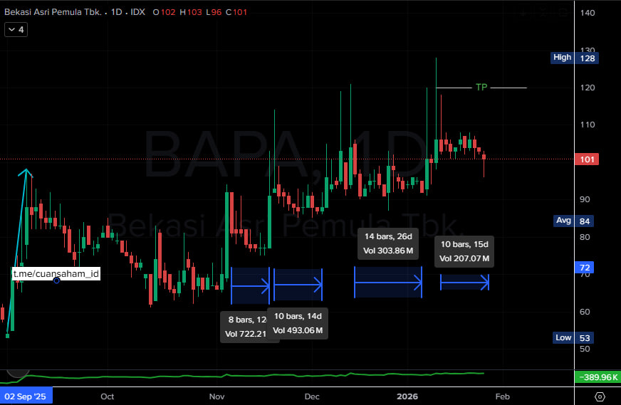 - Catatan : Harga bergerak konsolidasi setelah tekanan turun, mulai membentuk base dengan pantulan teknikal namun struktur belum valid uptrend.