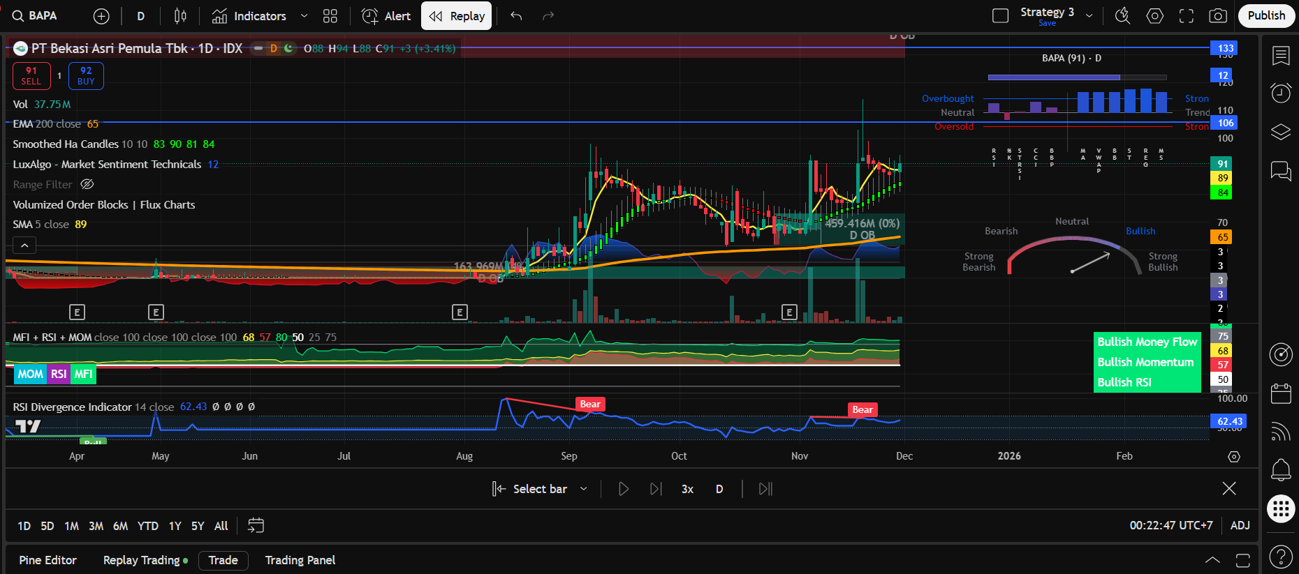 Analisa Sistem: Harga berkonsolidasi di atas EMA9 dan MA14/21 yang mulai mengarah naik, dengan area 80–86 berimpit dengan support horizontal pasca rally awal November sekaligus dasar SuperTrend hijau. Koreksi-koreksi ke zona ini sejauh ini selalu ditolak dengan wick bawah panjang, menandakan adanya akumulasi pelan dari market maker.