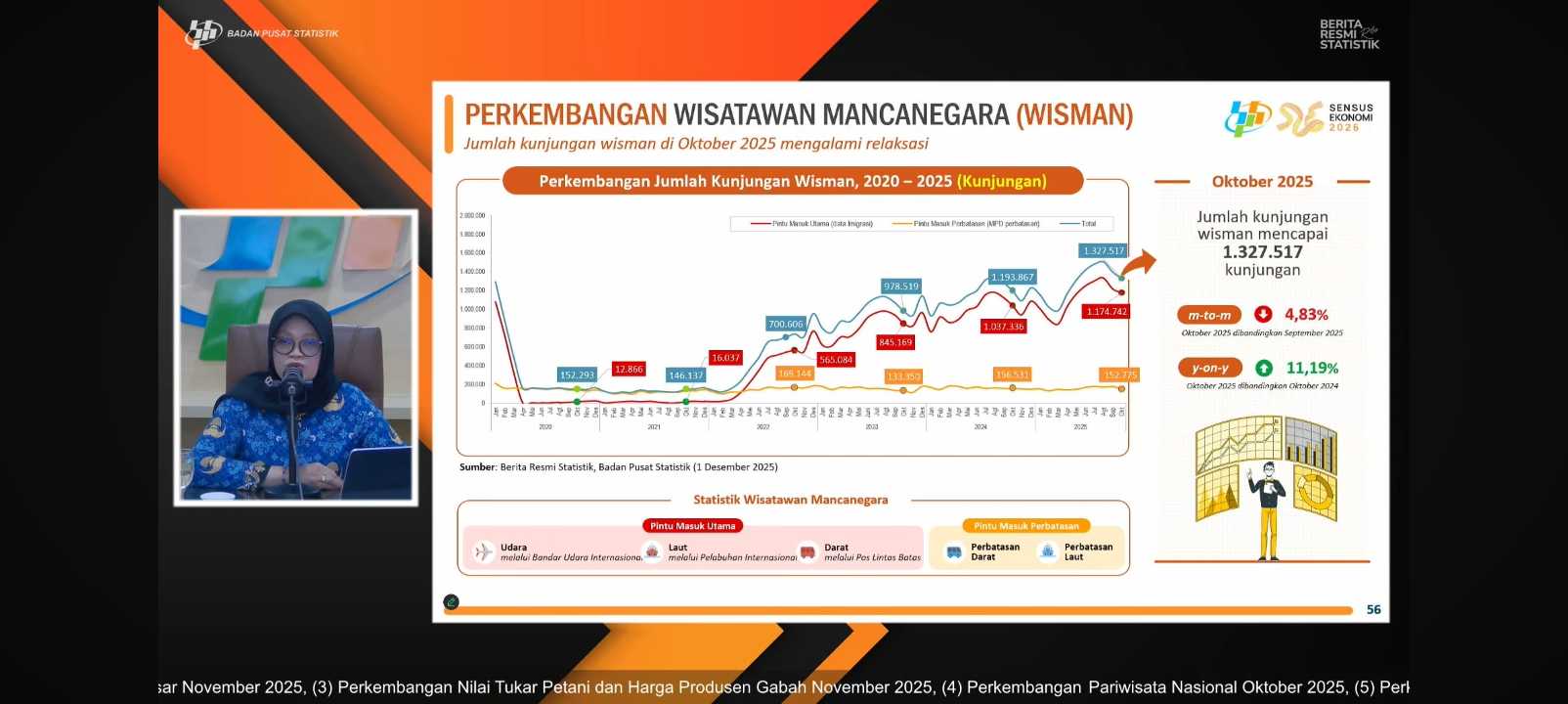 Kunjungan wisatawan mancanegara (wisman) ke Indonesia, dari luar ke dalam negeri, mencapai 1.327.517 kunjungan pada Okt 2025.