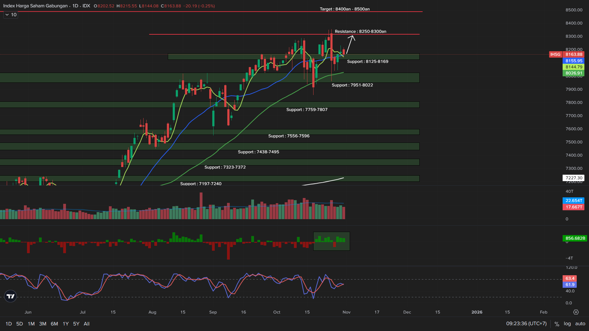 Indeks Harga Saham Gabungan atau IHSG diproyeksikan bergerak konsolidasi pada perdagangan hari ini, Senin (3/11) setelah sebelumnya ditutup turun 0,25% ke level 8.163 di perdagangan akhir pekan kemarin.