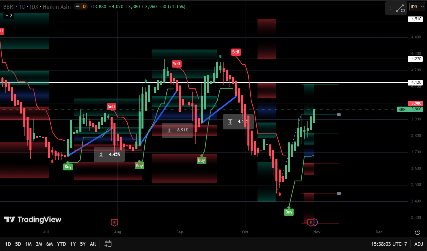 BBRI ini selama kedepannya mampu untuk bisa terus bertahan diatas area Supportnya 3860-3950, BBRI ini berpotensi sangat besar at the end kedepannya akan bisa lanjut naik menuju Targetnya yang ada di 4040-4070, atau bahkan at the end bisa ke 4170-4280 melihat momentum kenaikannya hingga saat ini juga masih sangat Kuat.