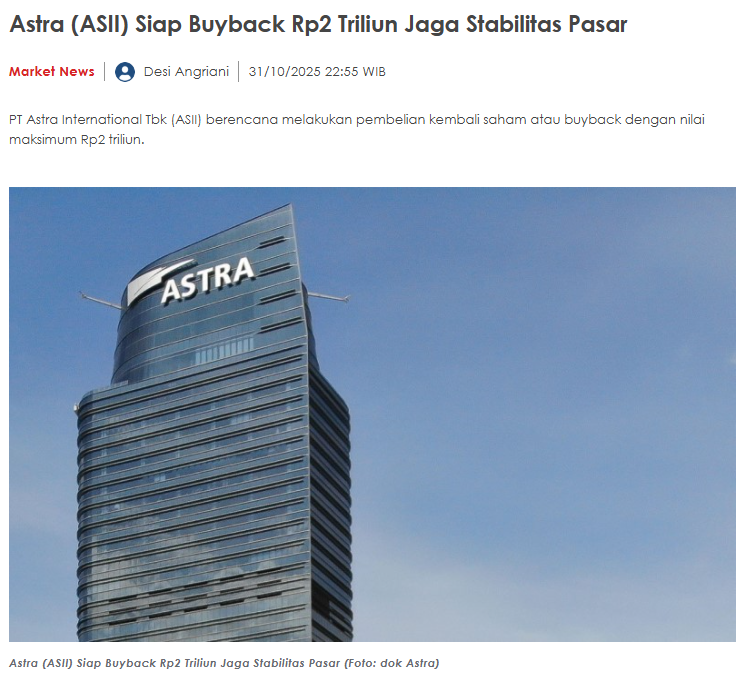 IDXChannel - PT Astra International Tbk (ASII) berencana melakukan pembelian kembali saham atau buyback dengan nilai maksimum Rp2 triliun. Rencana buyback akan dilaksanakan pada 3 November 2025 hingga 30 Januari 2026.