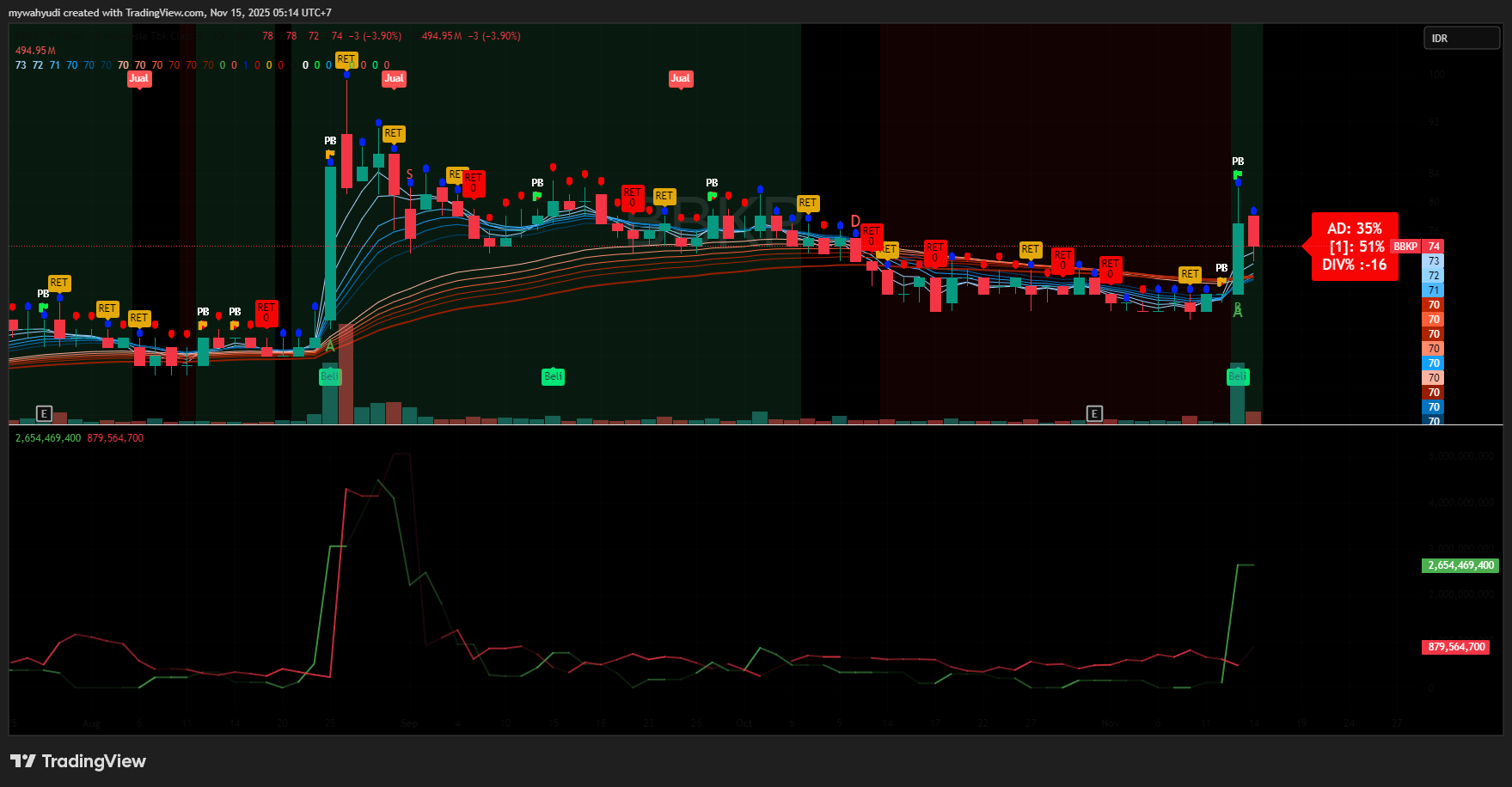 Kesimpulan Teknikal: Sideways / Konsolidasi di Area Bawah. Pergerakan harga di range sempit Rp70-Rp80 menunjukkan ketidakpastian tinggi dan dominasi spekulasi jangka pendek.