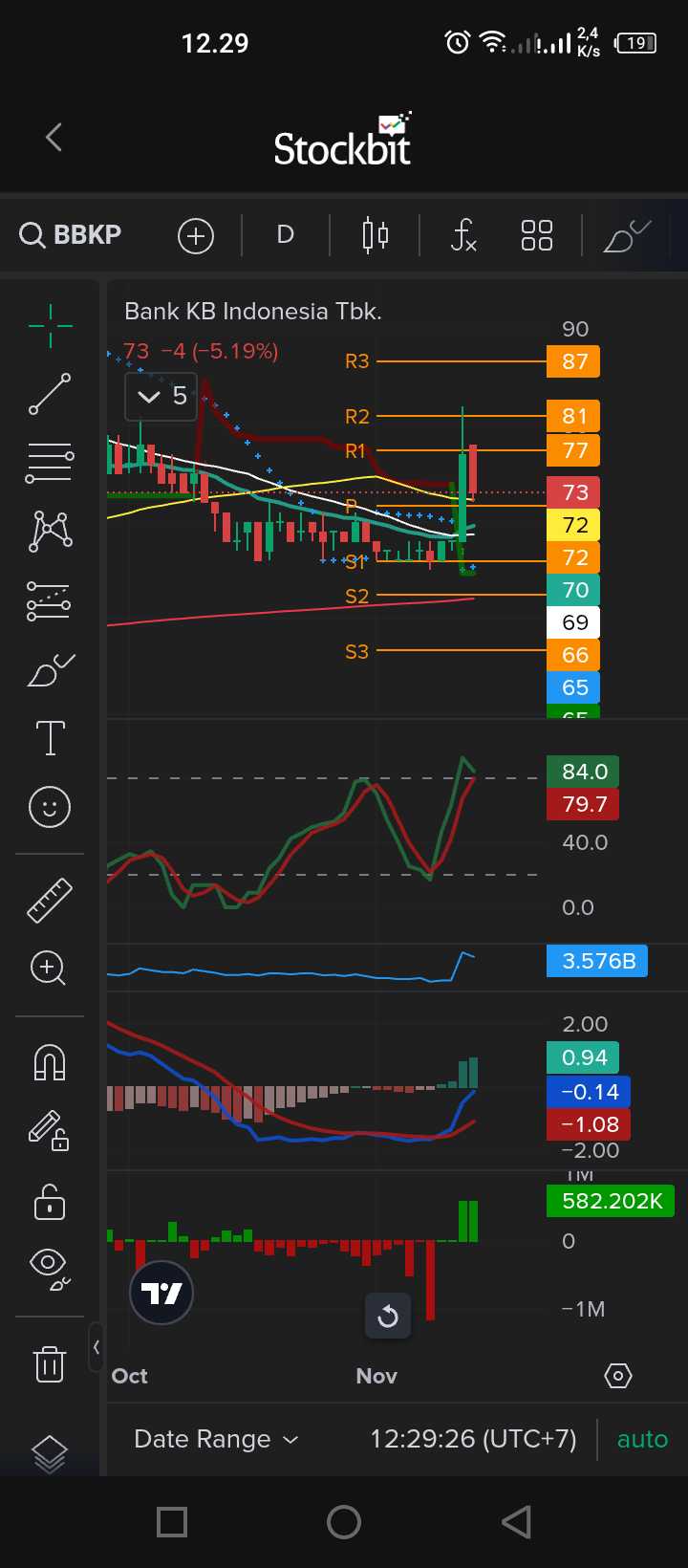 Kalau masih penasaran sama $BBKP, kemungkinan akan dites dulu di support pivot 72. Kalau ada tanda rebound, berarti ini hanya koreksi sehat. Tapi kalau melihat dari RSI yang sudah overbought dan turun sedikit ke bawah, sepertinya agak sulit ya. Apalagi fundamental BBKP memang jelek sekali. Mungkin hanya tinggal menunggu ‘keajaiban’ ada bandar yang mau goreng. Tapi bukan berarti tidak bisa, ya.