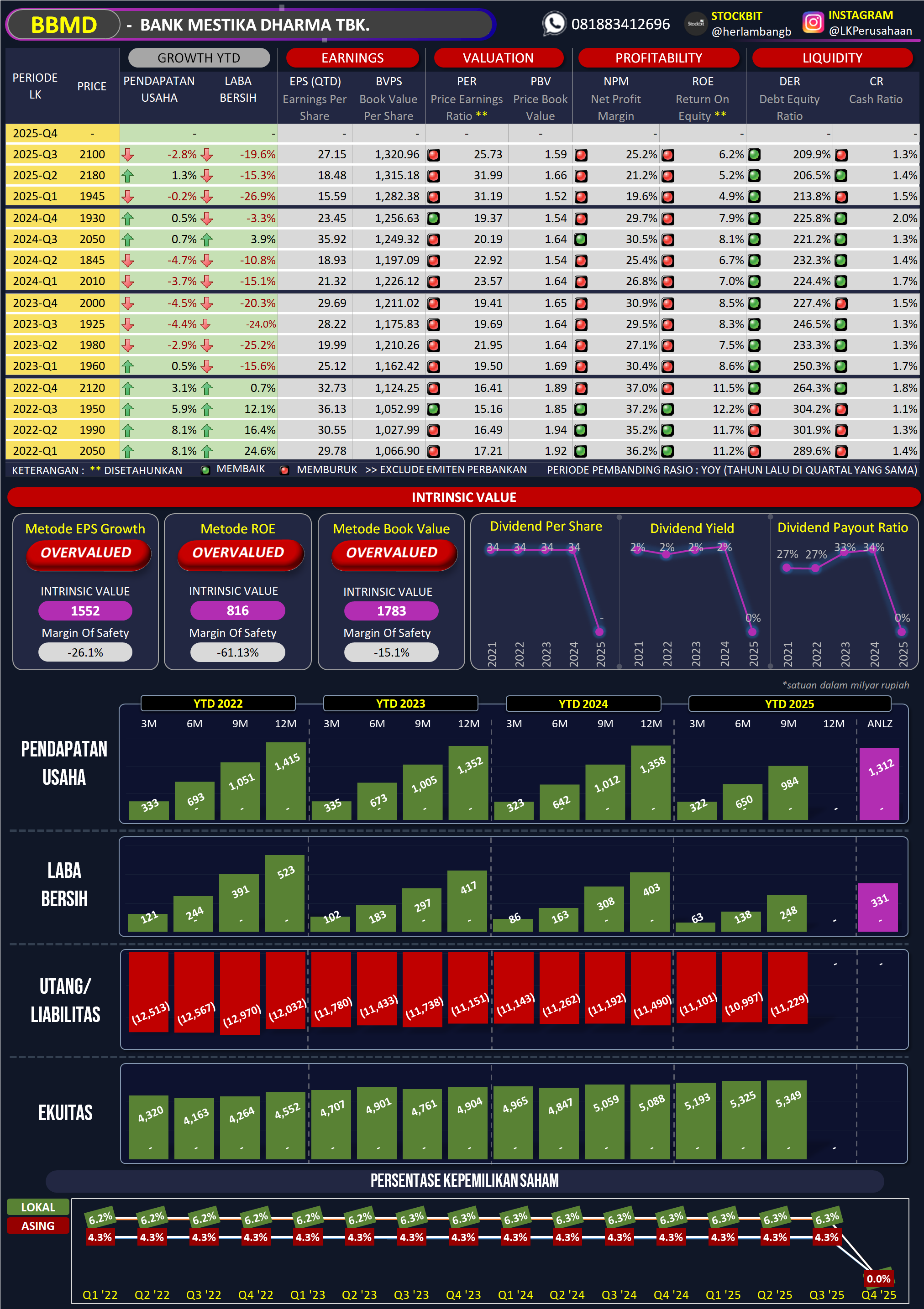 PT Bank Mestika Dharma Tbk. atau BBMD adalah Bank Umum Swasta Devisa yang memfokuskan usaha pada retail banking dan prinsip prudential banking. Pada tahun 2018 Perseroan memiliki 1 unit kantor pusat, 12 unit kantor cabang, 41 unit kantor cabang pembantu dan 13 unit kantor kas yang tersebar di Pulau Sumatera dan Jawa serta 70 unit ATM yang tergabung dengan jaringan ATM Bersama Interkoneksi ALTO/PRIMA.