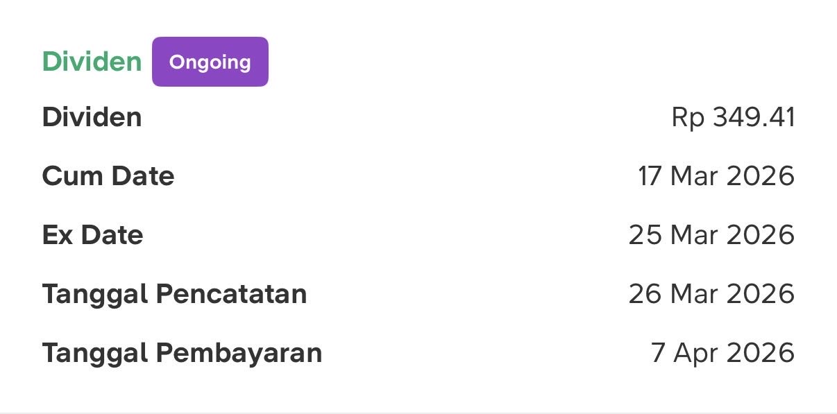 * Ex Date (25 Mar 2026): Hari pertama di mana saham diperdagangkan tanpa hak dividen. Jika Anda membeli saham pada atau setelah tanggal ini, Anda tidak akan mendapatkan dividen.
