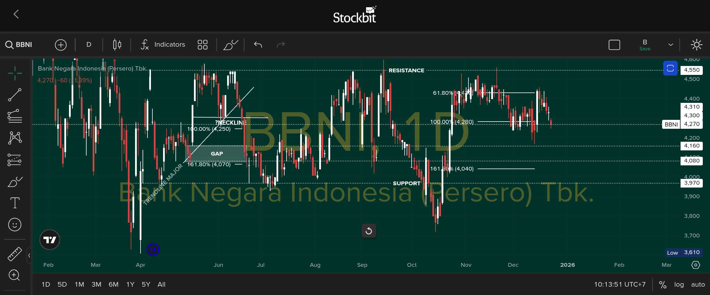 Alasan: Breakout 4.450 berpotensi mengonfirmasi momentum bullish lanjutan. BBNI biasanya cukup solid kalau resistance kunci ditembus, Boss.