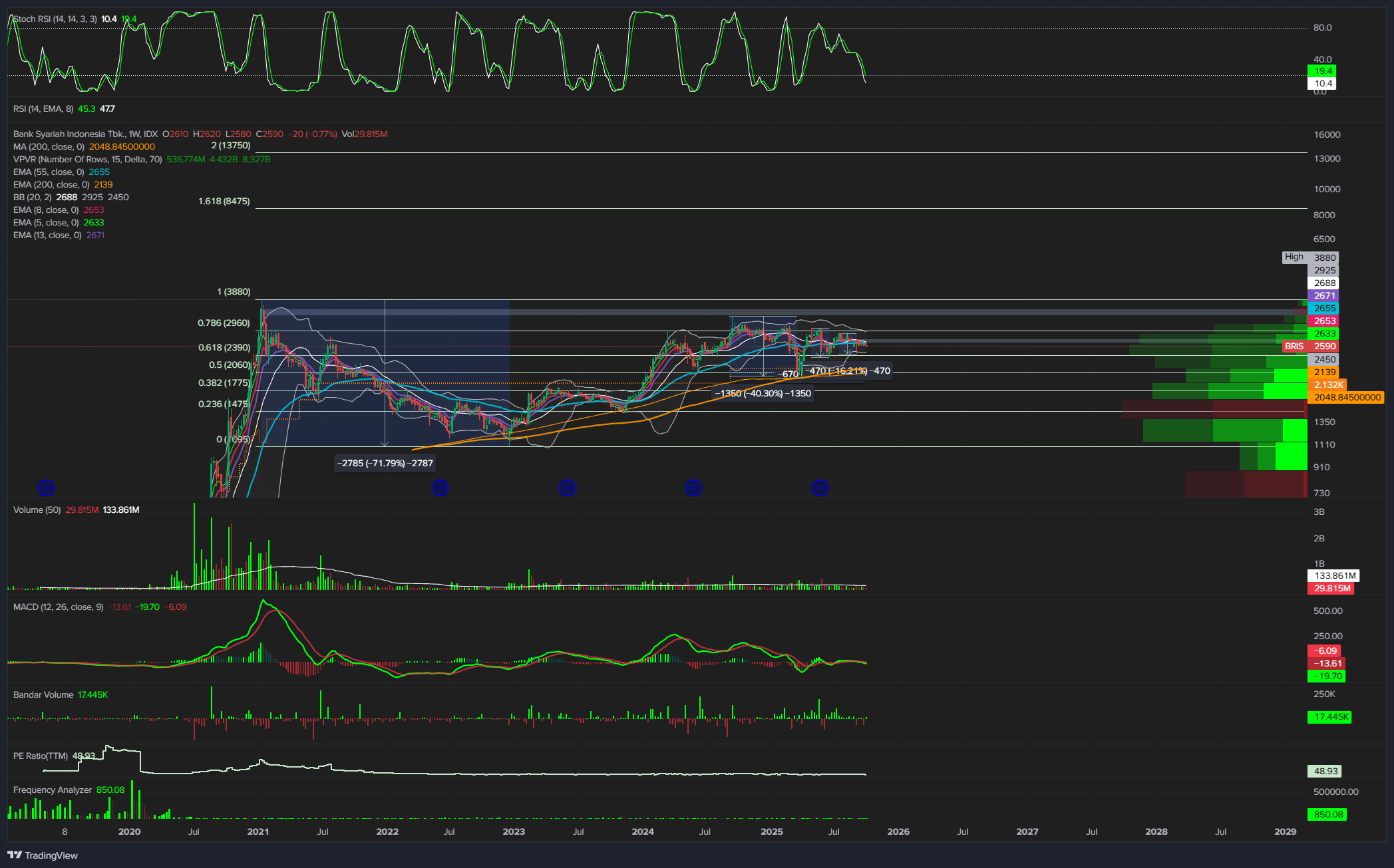 → Momentum menurun, RSI baru saja menembus garis MA RSI dari atas ke bawah → sinyal koreksi lanjutan.
