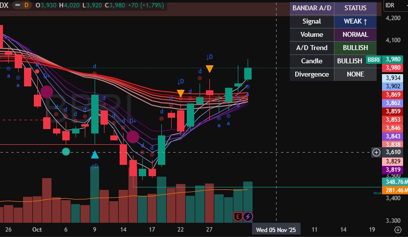 Harga saham #BBRI terlihat mulai bergerak naik pada perdagangan di minggu ini setelah tertekan turun di beberapa minggu sebelumnya