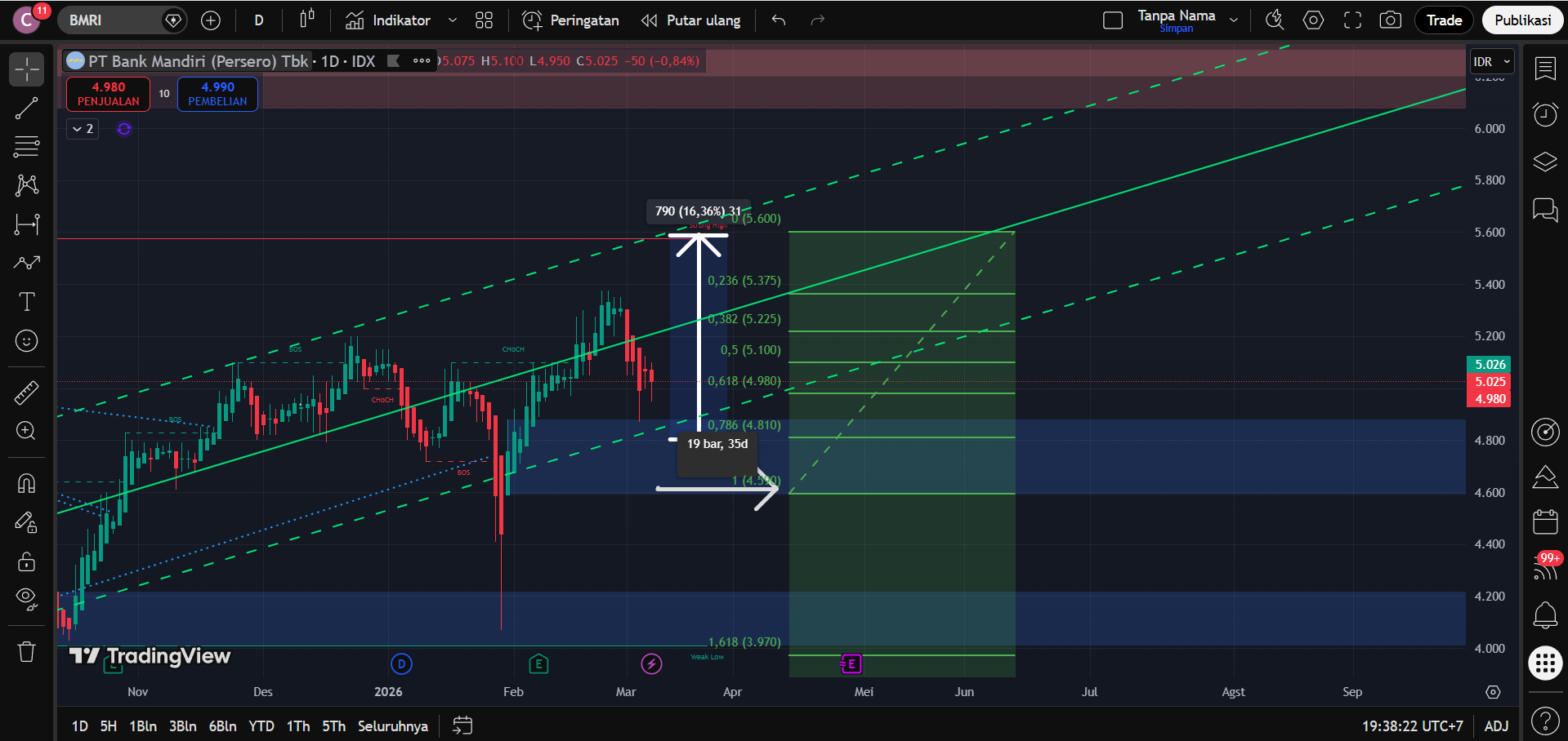 Alasan: Harga masih bertahan di atas support minor dan struktur swing masih cukup sehat untuk potensi lanjutan naik Boss.