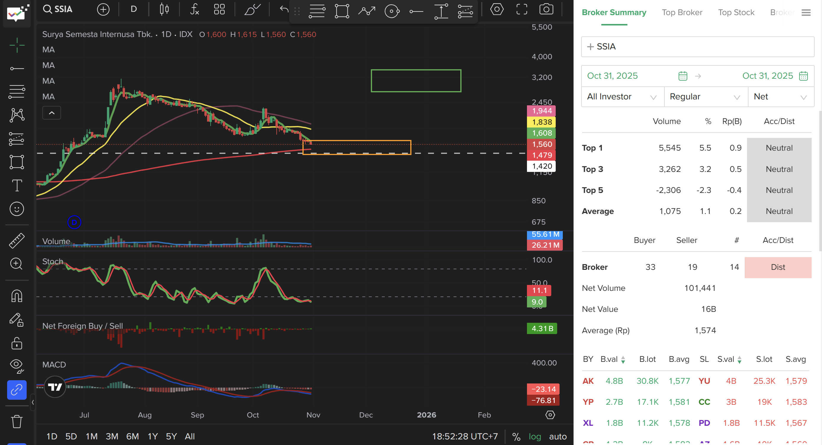 SSIA menunjukkan pola penurunan yang signifikan, dengan area support di sekitar 1.560 - 1.475 yang bisa menjadi level penting untuk mengamati kemungkinan pembalikan harga. Jika harga berhasil bertahan di atas area ini, potensi kenaikan menuju 1.835 atau 1.945 dapat terjadi, namun jika turun lebih jauh, bisa menguji level support berikutnya di 1.420. Indikator teknikal seperti stochastic dan MACD menunjukkan tren penurunan, meskipun volume perdagangan menunjukkan aktivitas yang cukup tinggi, yang berarti perlu perhatian lebih pada level support ini untuk mengonfirmasi arah pergerakan harga selanjutnya.