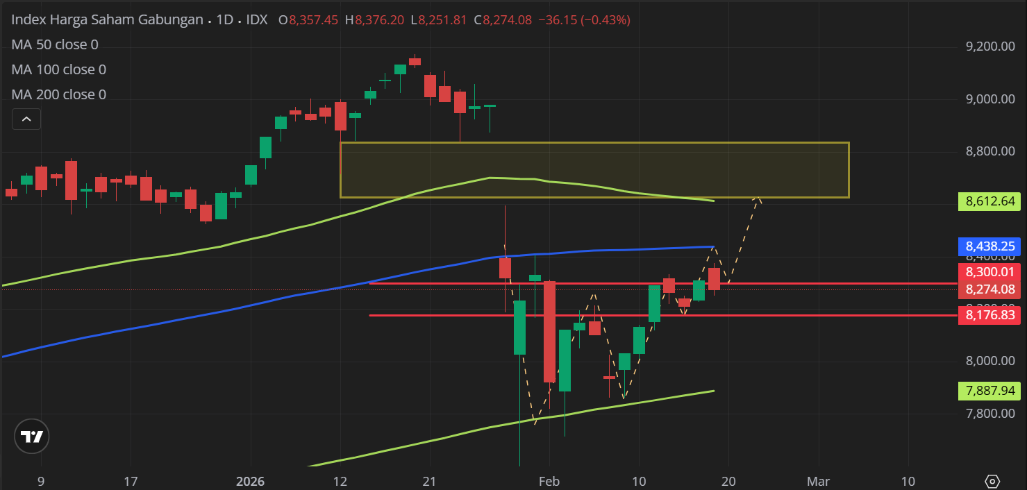 $IHSG masih fase sideways recovery di range support 8.176 dan resist dinamis MA100 area 8.300–8.400 an.