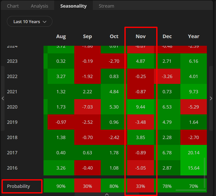 Memasuki bulan November, pasar saham Indonesia menghadapi fase yang cukup menantang sekaligus menarik. Berdasarkan data seasonality 10 tahun terakhir, probabilitas penguatan pasar di bulan November hanya sekitar 33%, menjadikannya salah satu bulan dengan kecenderungan koreksi yang cukup tinggi dibandingkan bulan-bulan lainnya seperti Desember yang memiliki probabilitas penguatan hingga 78%.