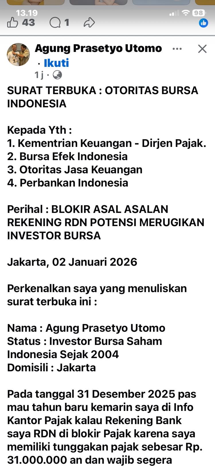 Demikian surat terbuka ini saya buat dengan sebenarnya dengan tujuan agar terjadinya perbaikan sistem dalam pemblokiran Rekening RDN Investor Retail Bursa Efek Indonesia.