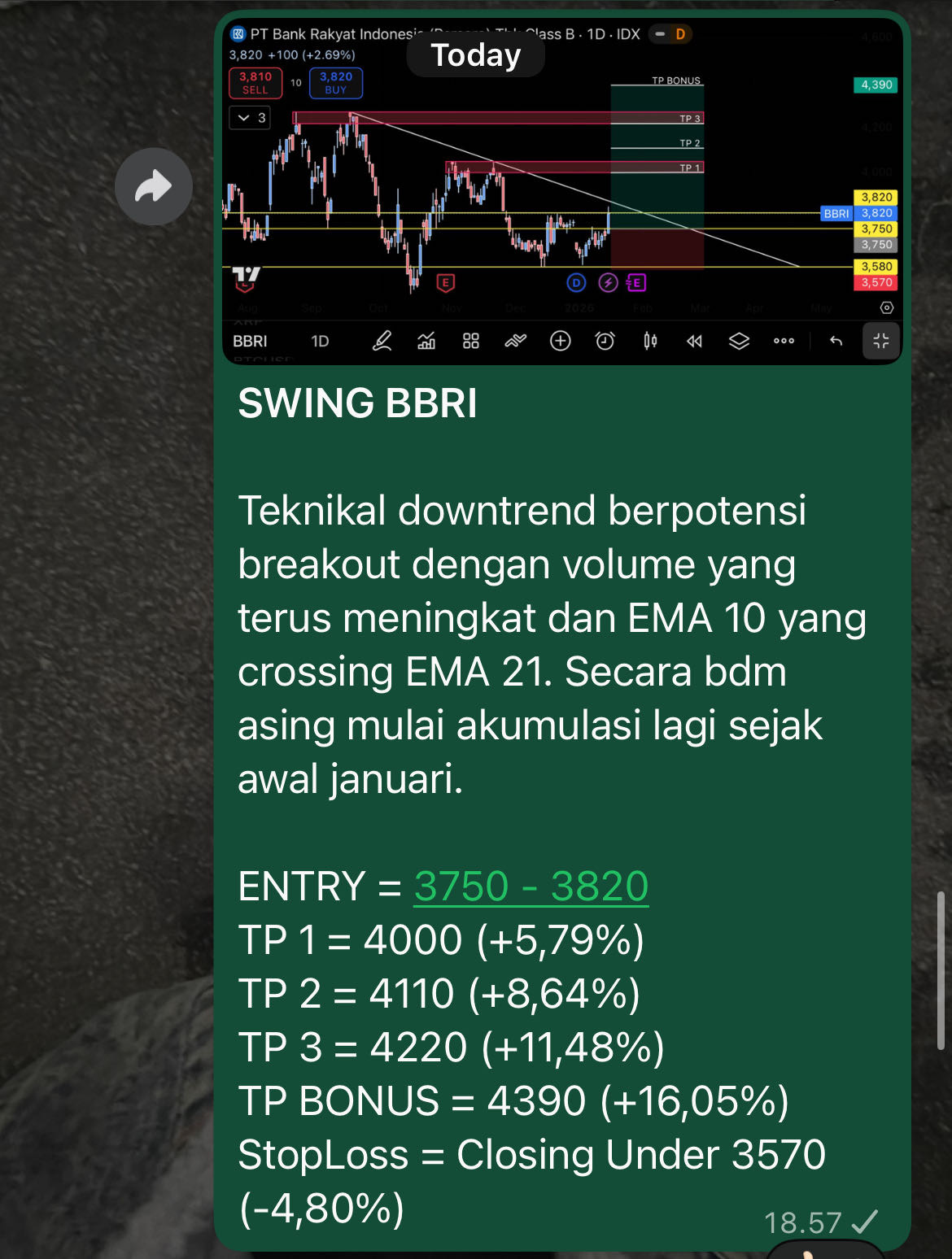 Area Akumulasi : Rp. 3.600 – Rp. 3.750