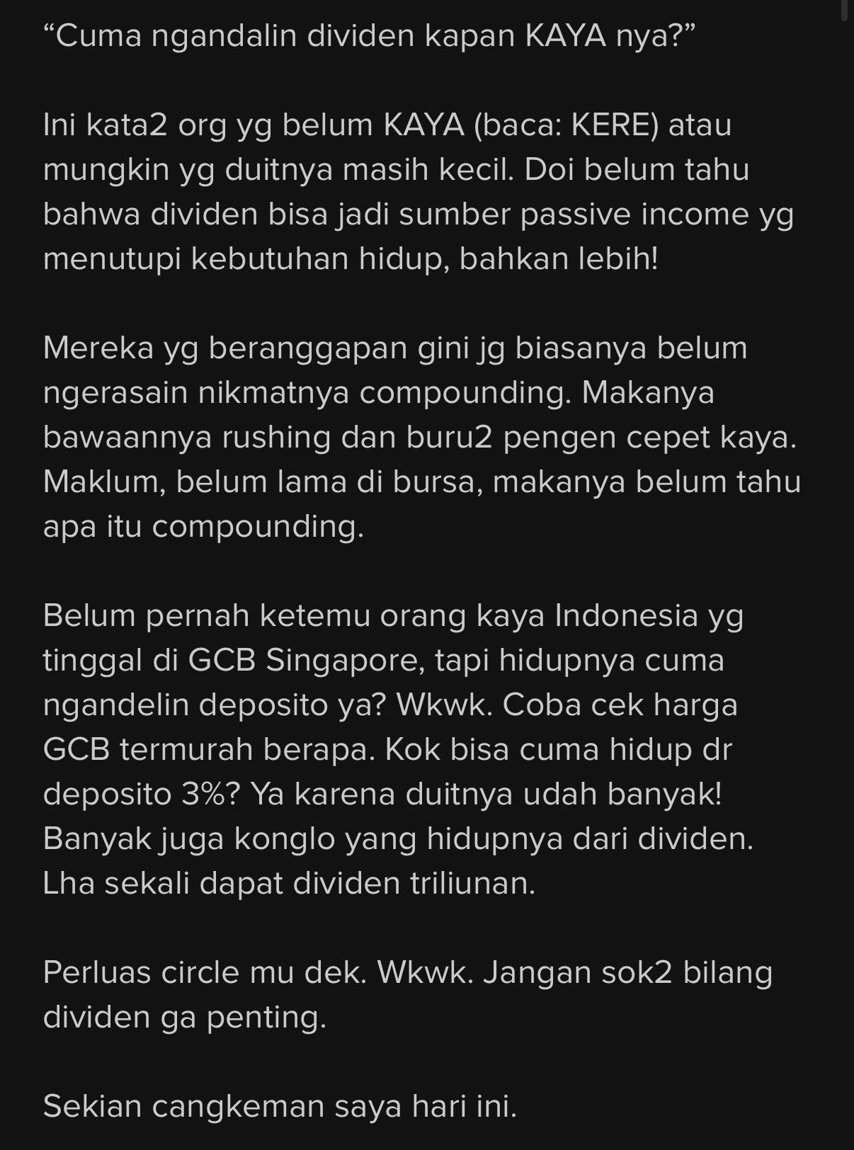 Tapi menurut keyakinan saya, kalau kalian punya pekerjaan formil dan hidup dari situ, fokus disana! kerahkan semuanya disana sehingga wadah income bisa lebih besar, jadikan saham sebagai leverage aset atau passive income mu.