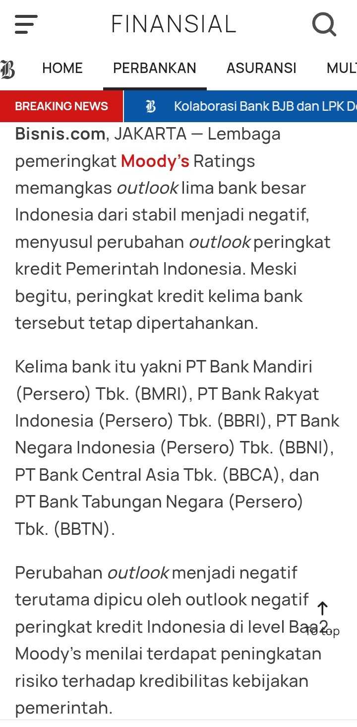 â Moody's juga menurunkan outlook 5 bank besar di Indonesia dari stabil menjadi negatif, walaupun rating tetap dipertahankan.