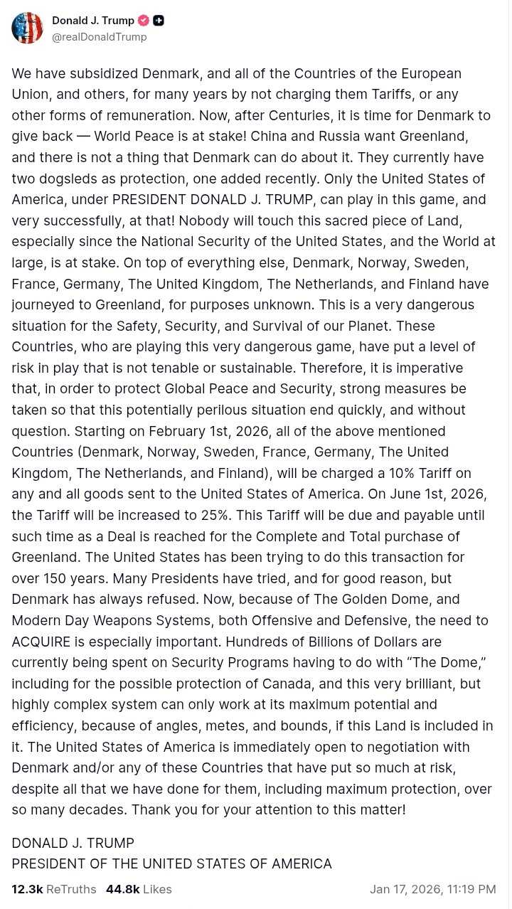 Trump mengenakan tarif impor 10% mulai Feb 2026 bagi negara-negara Eropa yang berniat mencegah keinginan Trump dengan mengirim pasukannya ke Greenland.