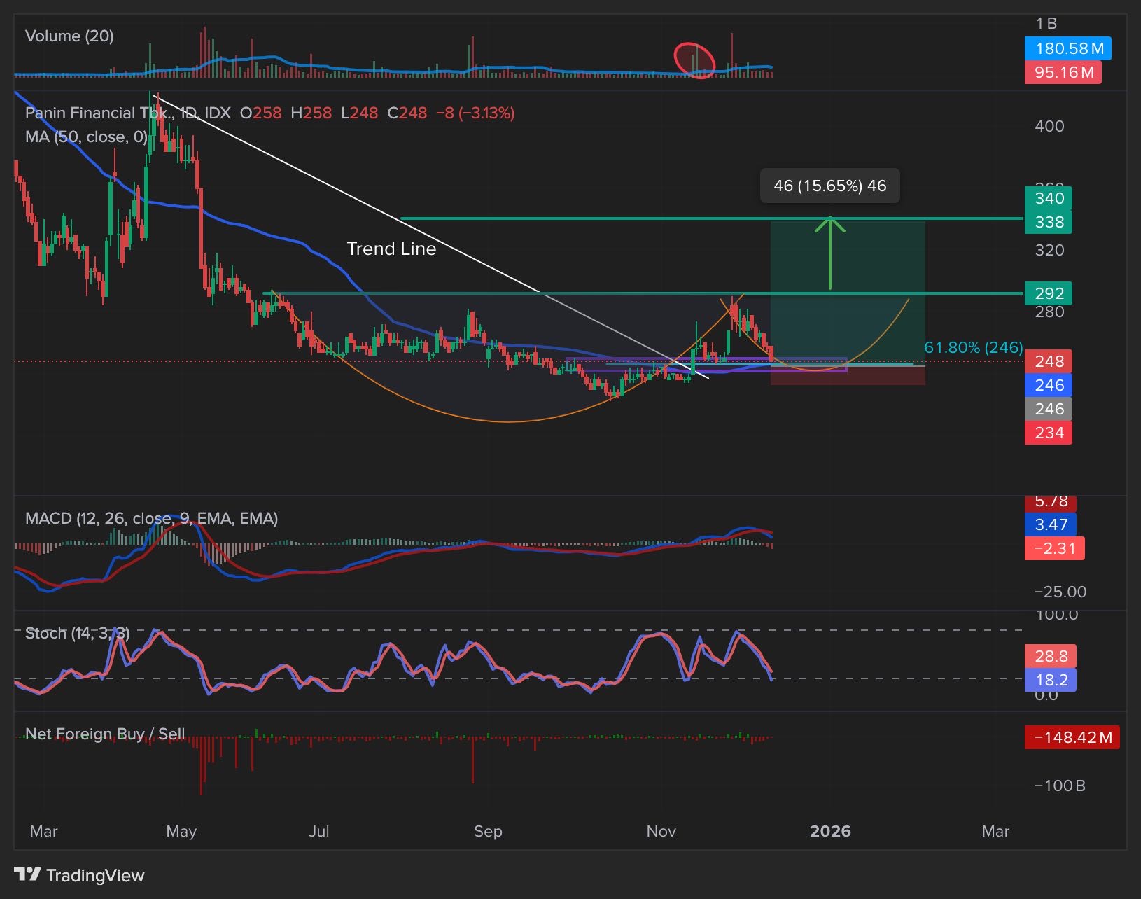 Secara trend, PNLF menunjukkan tanda-tanda pembalikan arah setelah berhasil keluar dari fase downtrend panjang yang ditandai oleh break pada trendline turun utama. Setelah breakout tersebut, harga mulai membentuk struktur higher low yang lebih stabil dan berulang kali bertahan di atas area RbS 246, mengindikasikan bahwa buyer secara konsisten menjaga . Secara chart pattern, PNLF juga terindikasi sedang membuat potensi pola cup & handle dengan neckline di 292, dan jika level ini break, maka target penguatan berikutnya berada di sekitar 338–340, sesuai proyeksi dari kedalaman handle. Yang membuat area sekarang semakin menarik adalah posisi harga yang berada tepat di zona 61.8% Fibonacci retracement, yang bertepatan dengan support minor di rentang 234–248, memperkuat confluence sebagai titik pantul potensial.