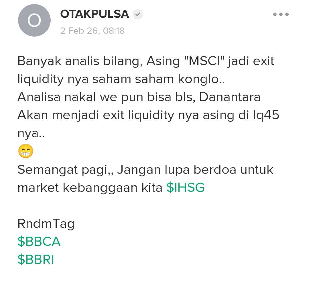 Sudah mulai pulh dan normal. Berkat berita positif hasil pertemuan BEI dan MSCI...